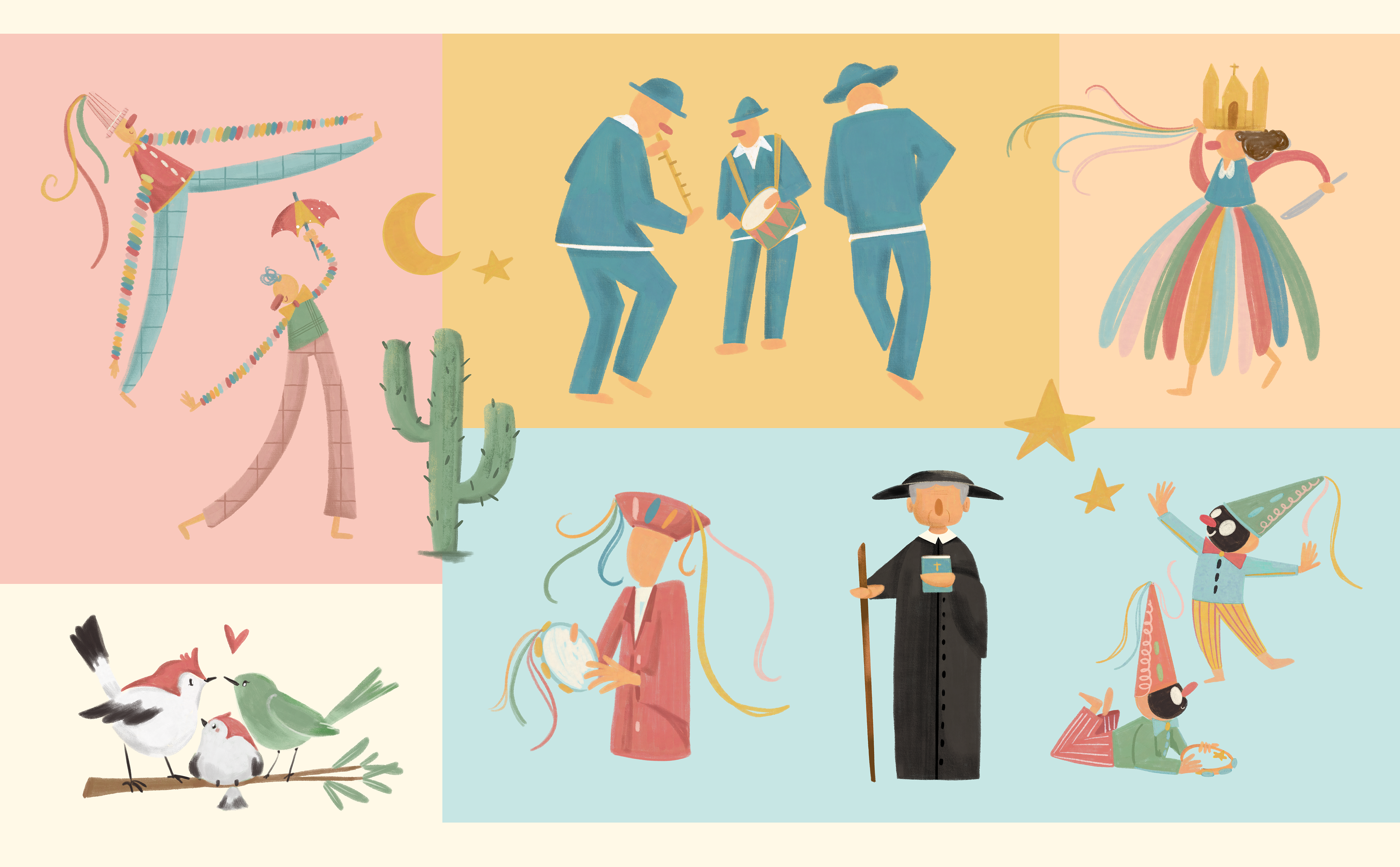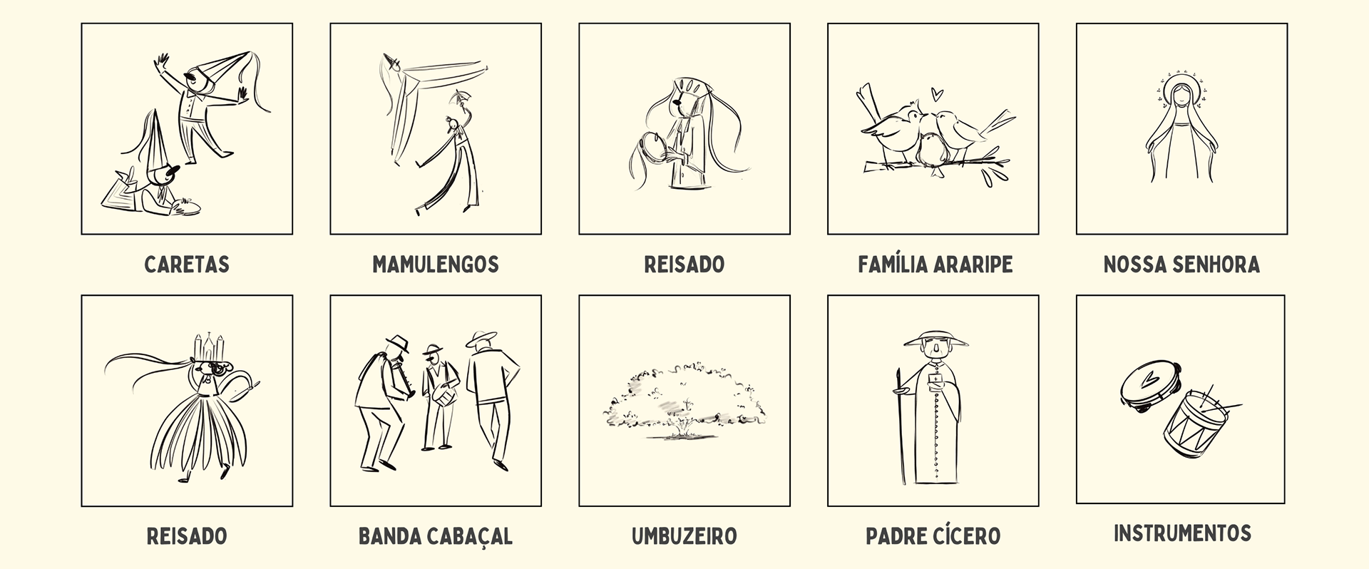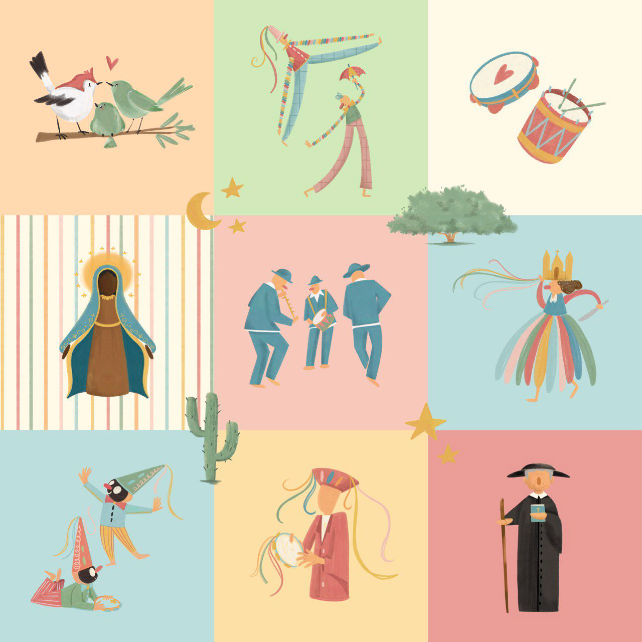 EN This digital artwork was inspired by the culture of the Brazilian Cariri region, specifically that of Ceará. This culture is marked by a rich folk tradition and strong religiosity, especially surrounding Padre Cícero and the pilgrimages of Juazeiro do Norte. This culture manifests itself in diverse forms, such as music (baião, forró, repente, coco), dances (reisado, maracatu), crafts (leather, clay, embroidery, wood) and cordel. Here it has been transformed into a children's illustrated set full of color and meaning.